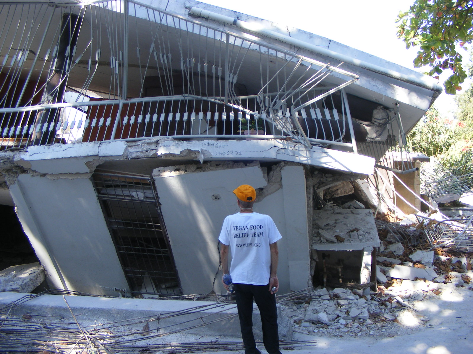 Richard Higgins – Eco consultant for the NGO New Directions Foundation goes to help with the sanitation crisis at the international earthquake relief effort in Haiti.On a cold morning in mid January 2010 Richard received a phone call from an old friend in New York requesting him to go to the Dominican Republic to assist and arrange entry of an international food group intending to go into Haiti to offer vegan food relief to the victims of the massive earthquake that occurred on Januray 12th. There were already 300,000 orphans in this country, before the earthquake and 98% of the country has been deforested.The most environmentally degraded and poorest country in the western hemisphere, Haiti immediately became a very high risk place where air lift insurance cost more than in Afghanistan.Richard accepted the proposal with the agreement that once the food group was established, he could work on his long time favourite – sustainable sanitation and food security. Richard had helped form, some fifteen years ago, and is now the lead eco consultant, for the NGO, New Directions foundation, based in London that has large proposals for building sustainable earthquake proof houses out of polyols.Funds were received from New York and four days were spent kitting out, debriefing and printing T shirts in the UK before flying out to the Dominican Republic. Richard took a long time professional friend and Permaculture specialist with him, Andrew Crayton, aka Gaura. Together they were to research the best method of entering the then, dangerous country where hold up and bribery were common at the border, which was the only way into the country. The airport and dock having been badly smashed by the earthquake. They flew in and set up base in a down town hotel in the Capital, Santo Domingo.Contact was established with the Chamber of Commerce and Richard and Andrew met with the Director and Treasurer at their headquarters where it was decided that they would escort Richard and his team ‘Food for Life Global’ into the capital of Haiti, to aid the desperate situation. The mother of the treasurer had founded a convent many years previous and that is where Richard and the team head of security, Andrew, were accommodated for a period of three months. Arriving there just three weeks after ‘the worlds largest disaster to happen in one place’ – there was still chaos to be seen everywhere and the stench, in the blazing sun, of rotting corpses that still lay in the thousands of collapsed buildings. If you stayed in Port au Prince for six months and went about your daily aid work you would still not see all the devastation that had occurred.Thanks to the UN security forces, who themselves lost many men in the giant quake, and the very fast mobilization of the US military, the situation became tolerable considerably quickly. Many more people died in this earthquake than were quoted in the press and it has recently been estimated at 300,000, as many of these buildings were built without planning or building codes and there were no records of the residence.